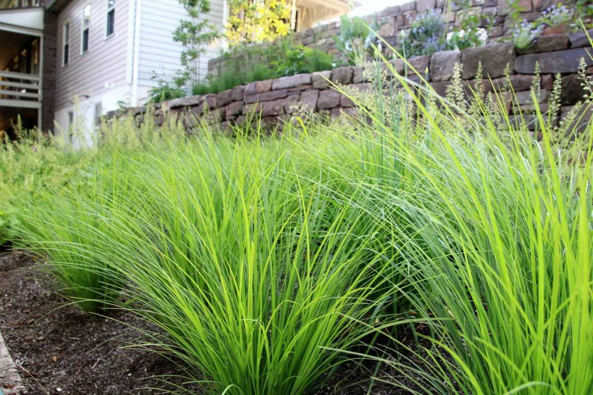 - 使用不同高度的相似植物来创造种植结构和尺度兴趣,例如将日本森林草与较高的雪兰多柳枝草或羽毛芦苇草相结合。