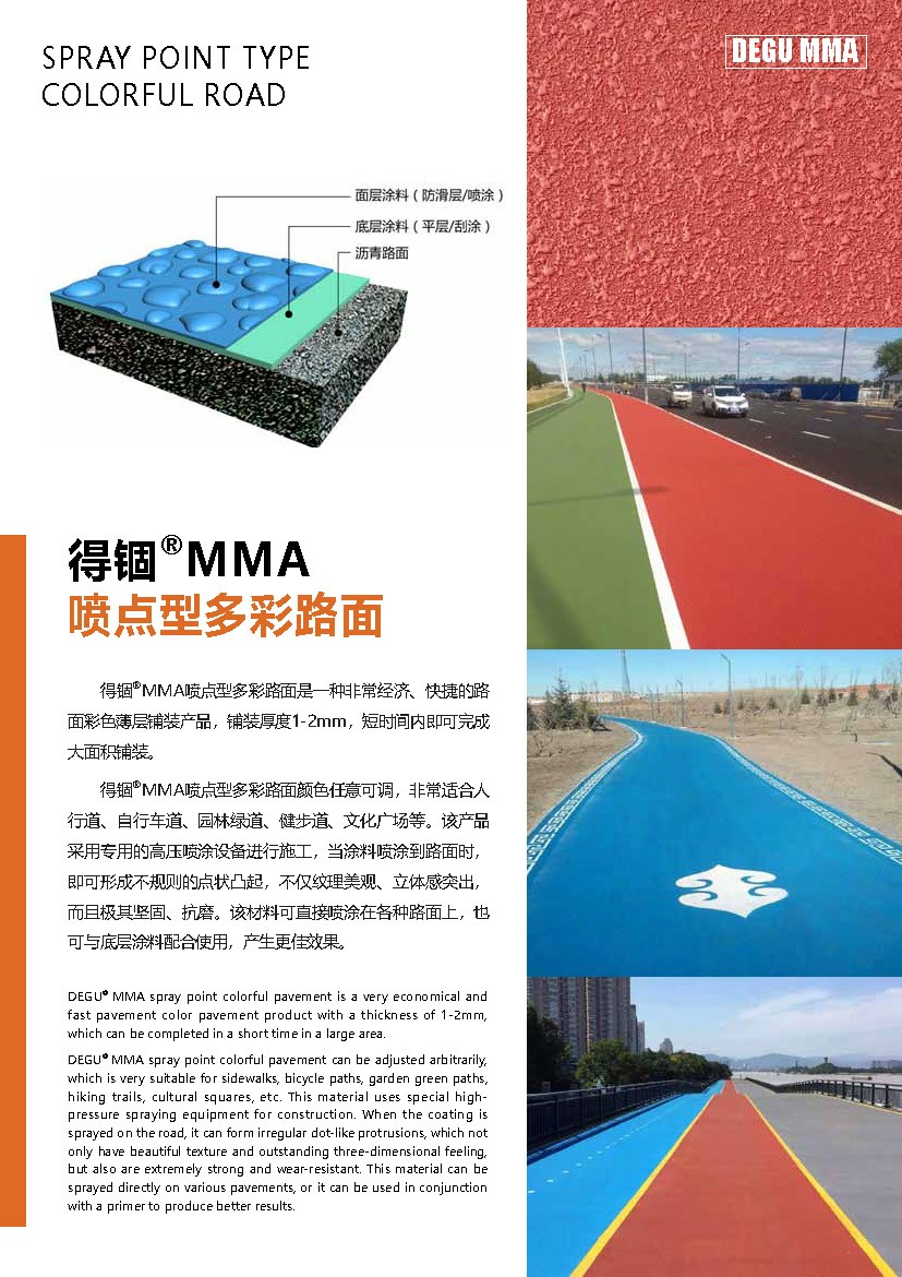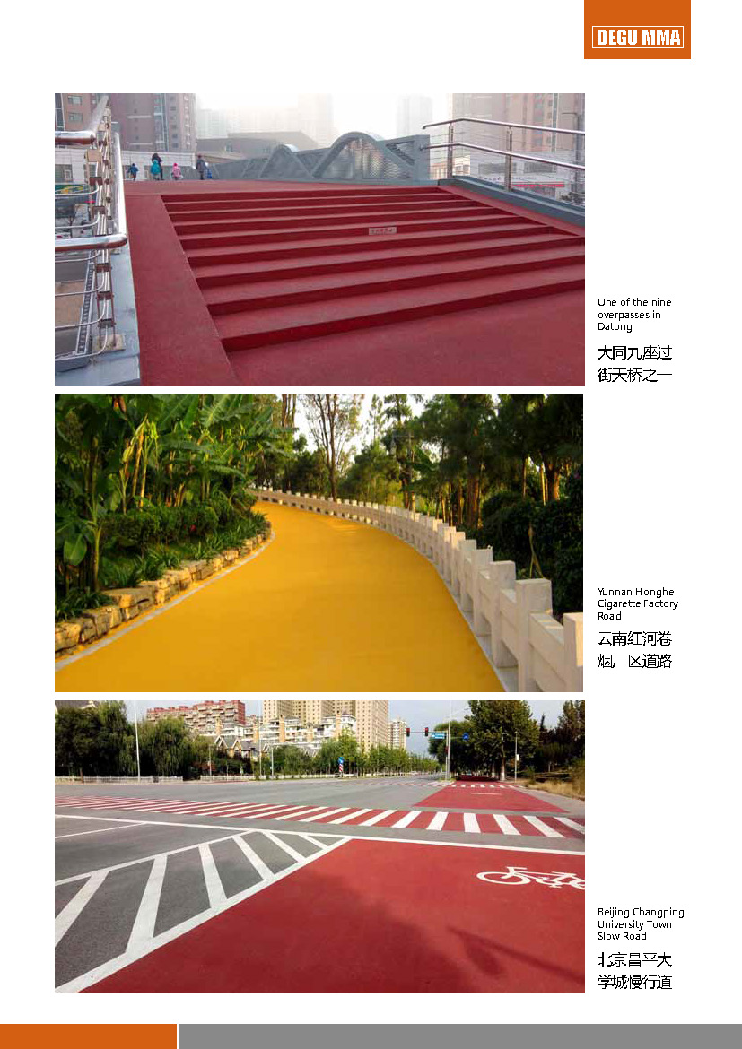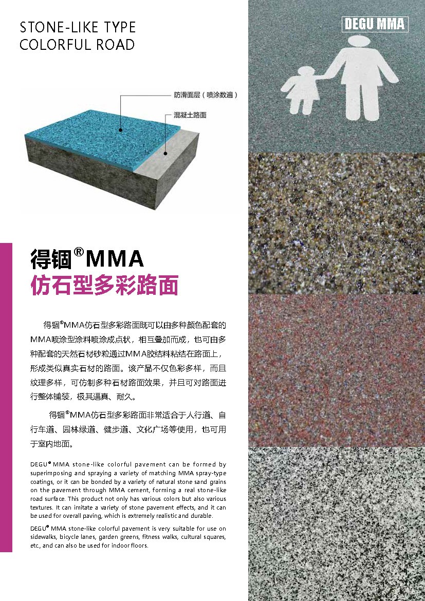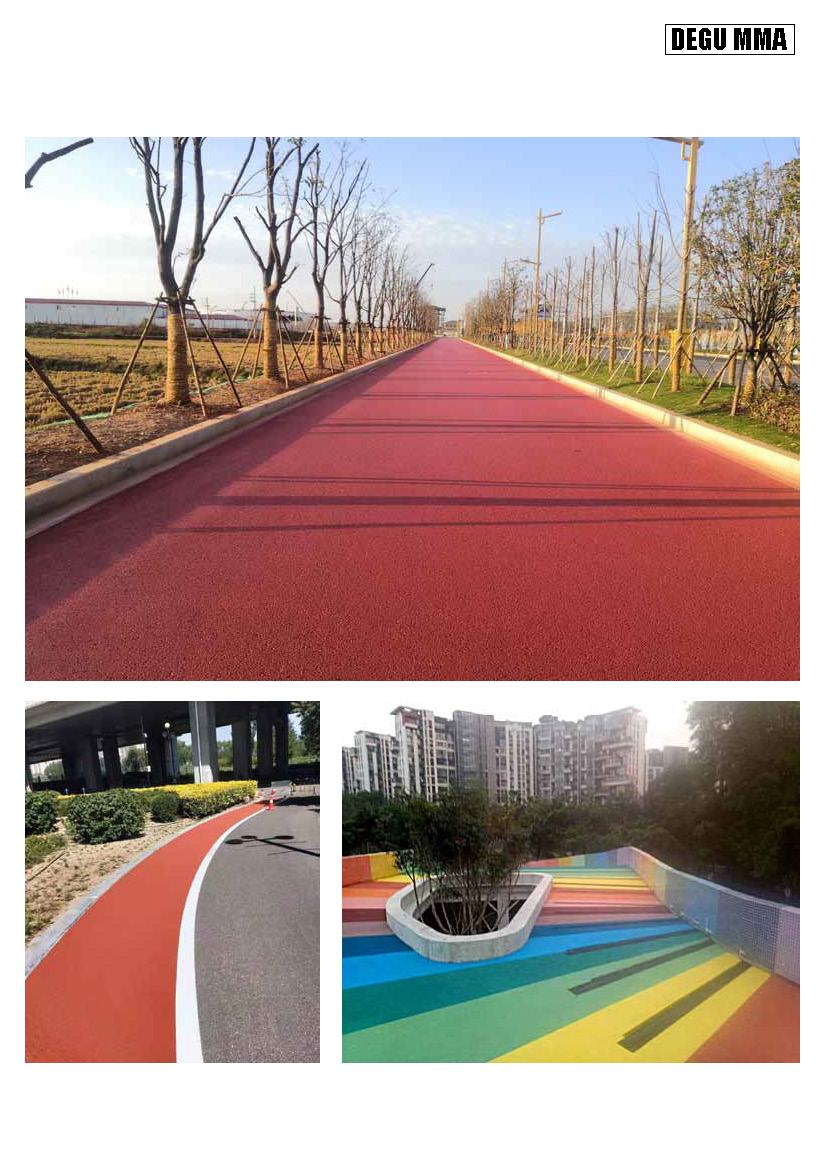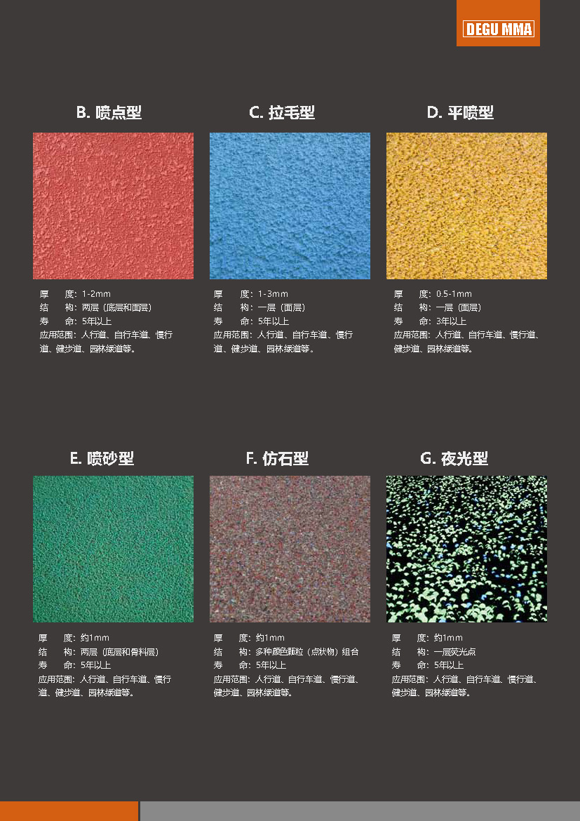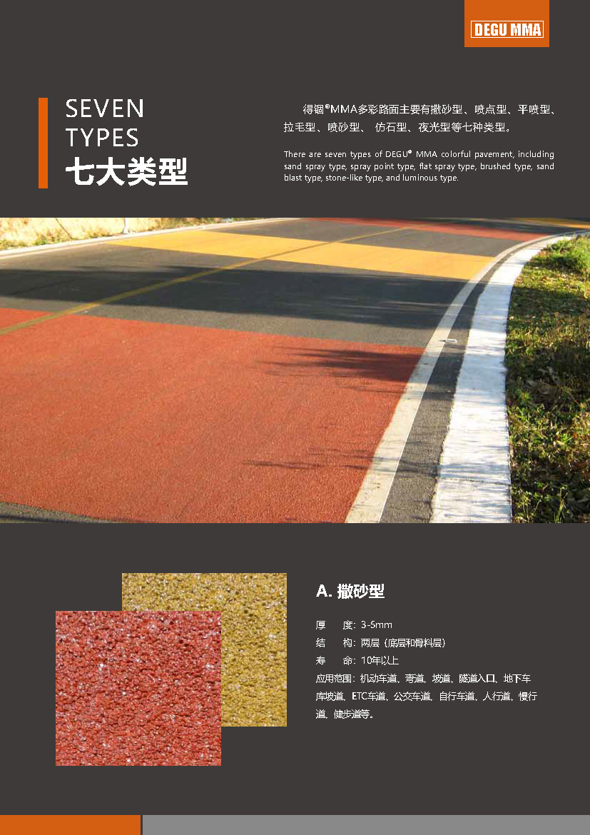 There are seven types of DEGU° MMA colorful pavement, including sand spray type,spray point type, flat spray type, brushed type, sand blast type, stone-like type, and luminous type.