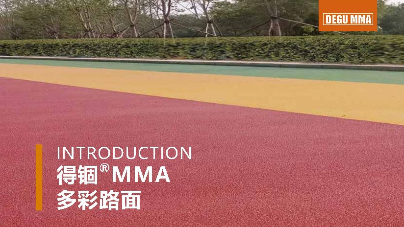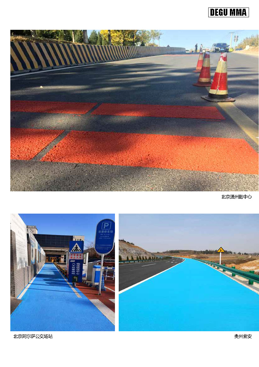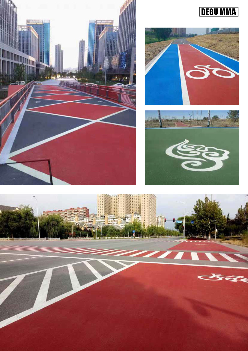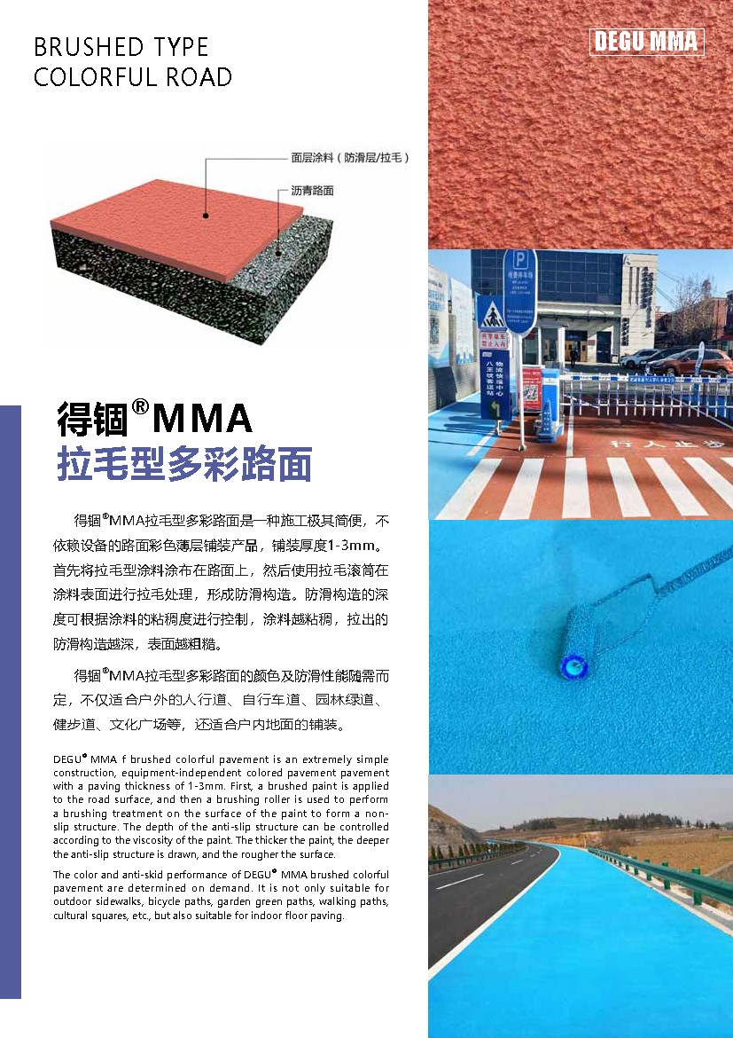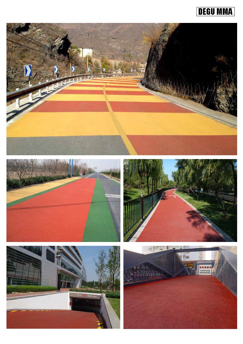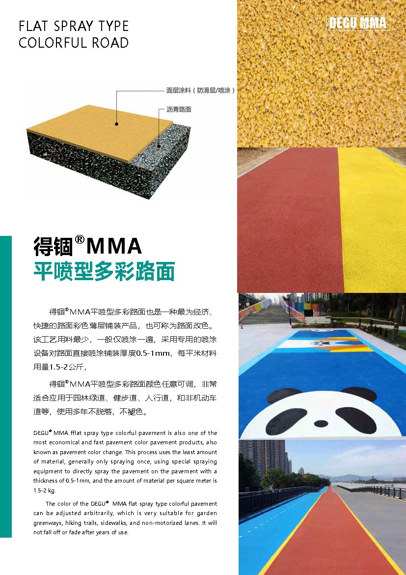 There are seven types of DEGU° MMA colorful pavement, including sand spray type,spray point type, flat spray type, brushed type, sand blast type, stone-like type, and luminous type.