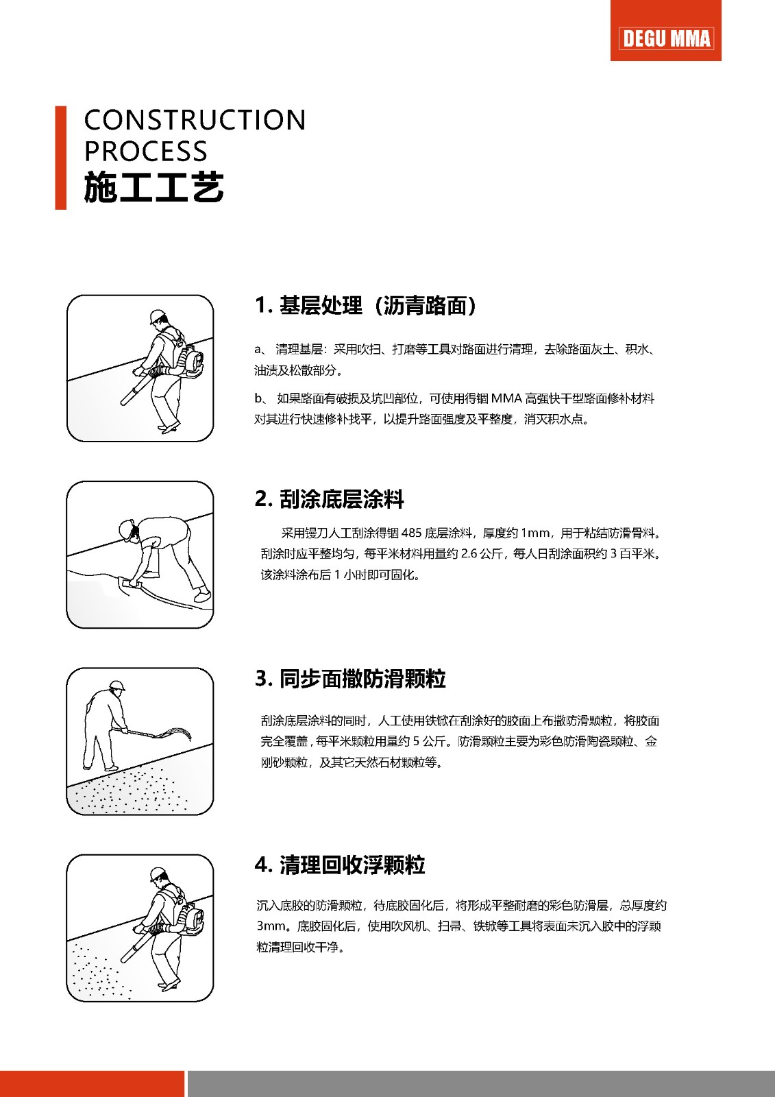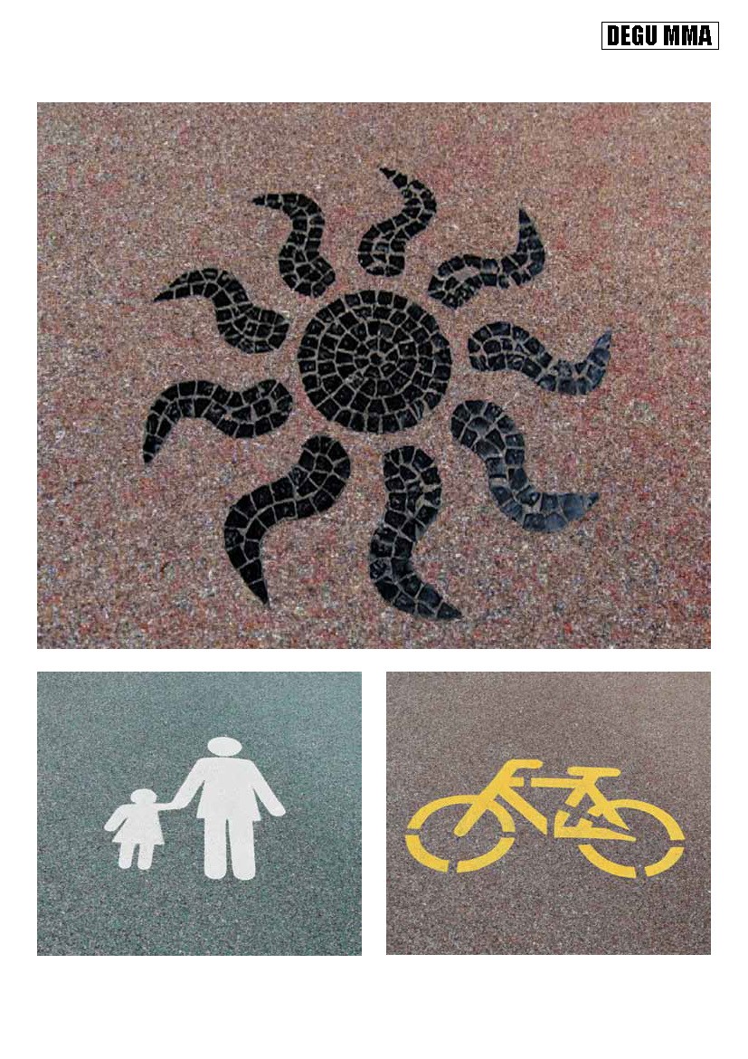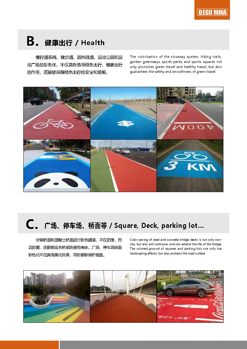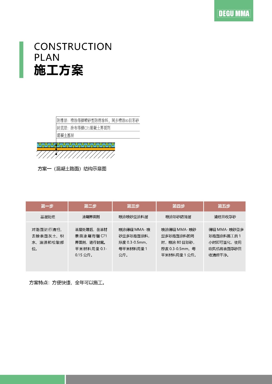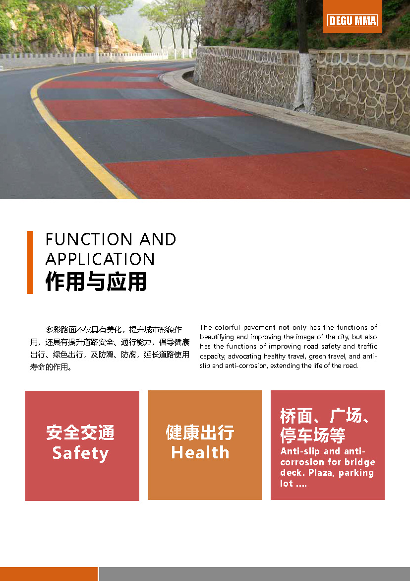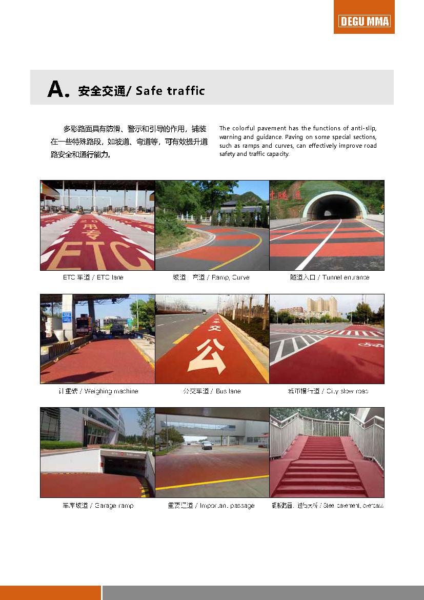 There are seven types of DEGU° MMA colorful pavement, including sand spray type,spray point type, flat spray type, brushed type, sand blast type, stone-like type, and luminous type.