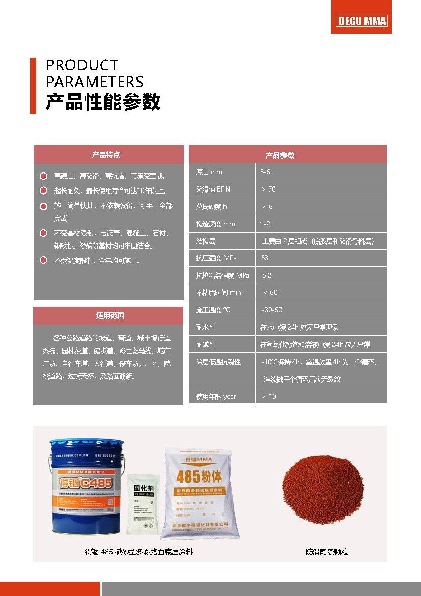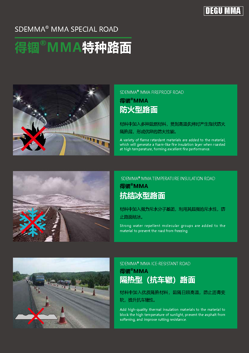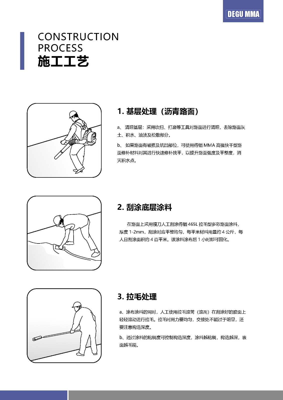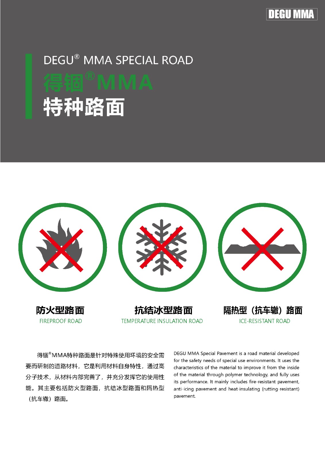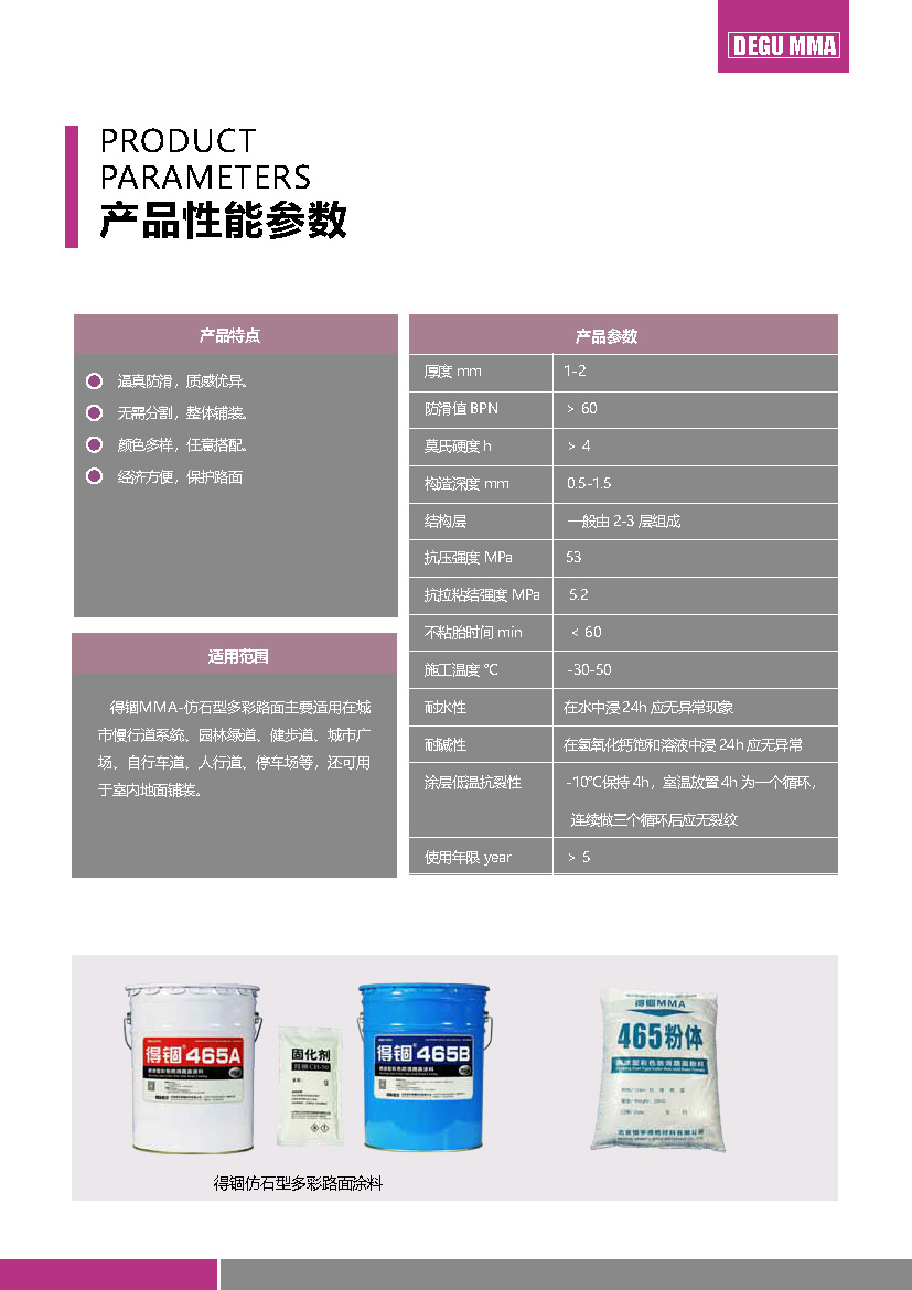 There are seven types of DEGU° MMA colorful pavement, including sand spray type,spray point type, flat spray type, brushed type, sand blast type, stone-like type, and luminous type.