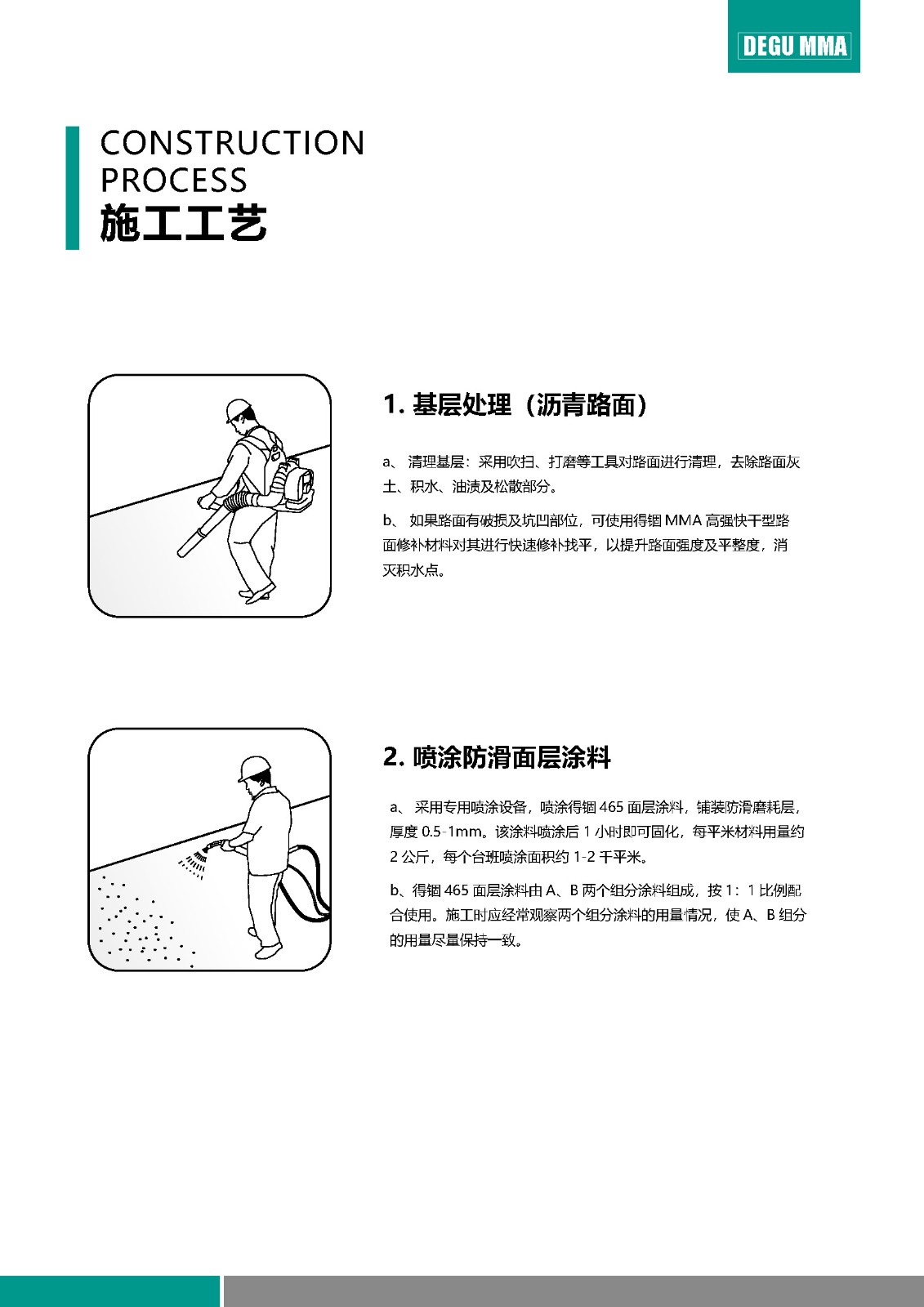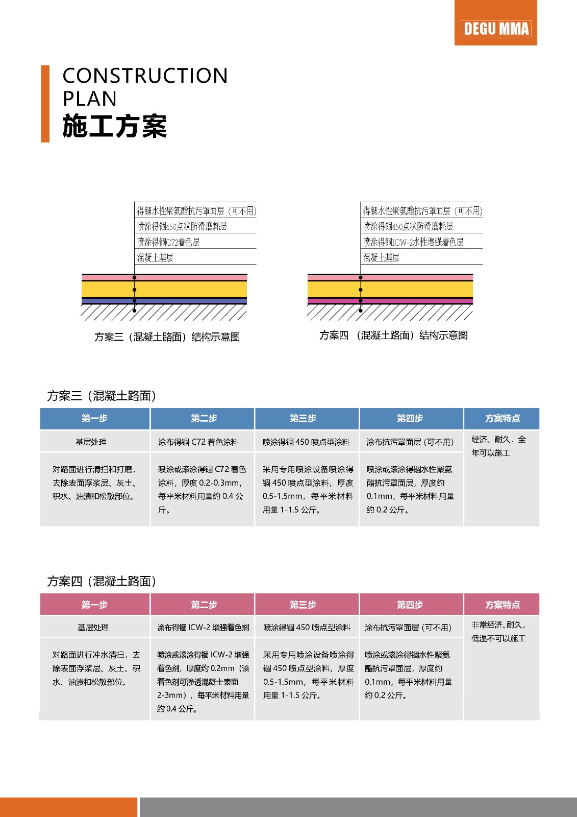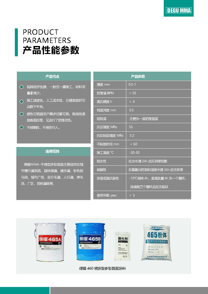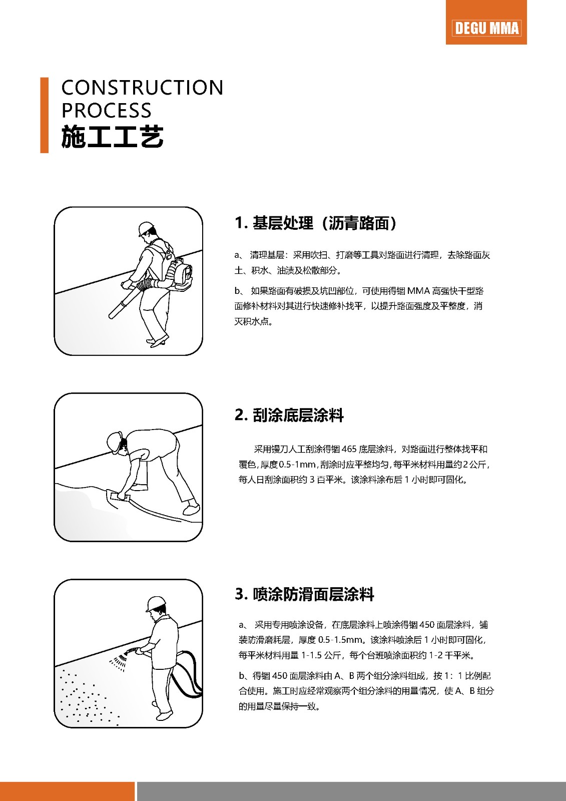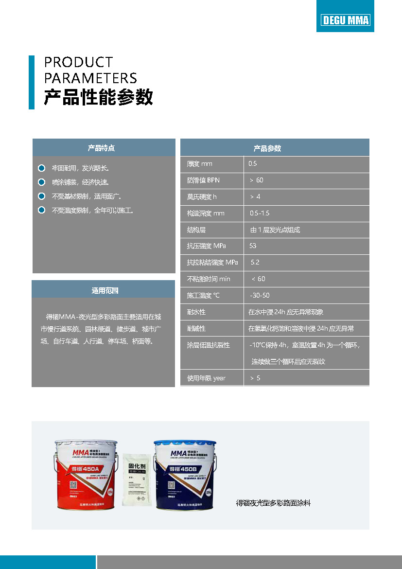 There are seven types of DEGU° MMA colorful pavement, including sand spray type,spray point type, flat spray type, brushed type, sand blast type, stone-like type, and luminous type.