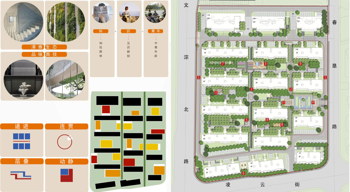 项目含高层、联排洋房、板楼产品,结合地理文脉与客群需求,在金地360°健康家的定位基础上,发展景观主题:新文人园,风格定位现代中式。
