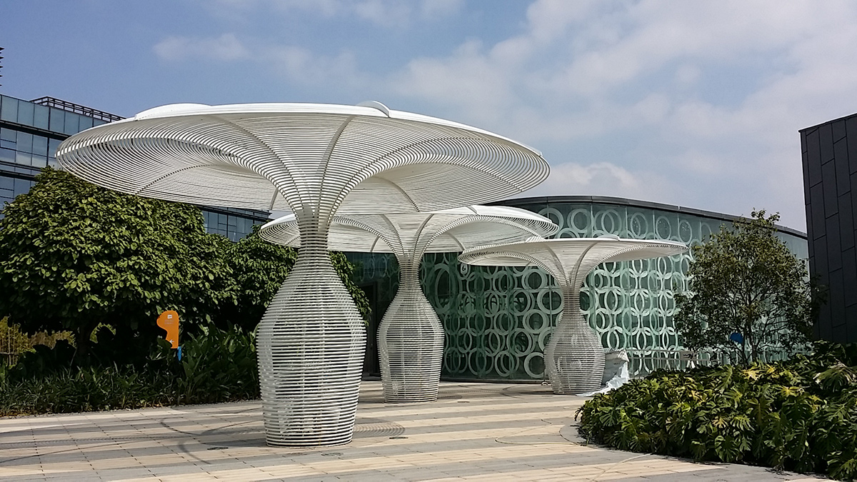 购物中心的屋顶花园更是将室外景观与商业完美的融为一体,不仅空间层次丰富,更是有景致的商业小筑和别致的伞形小品设施点缀其中。